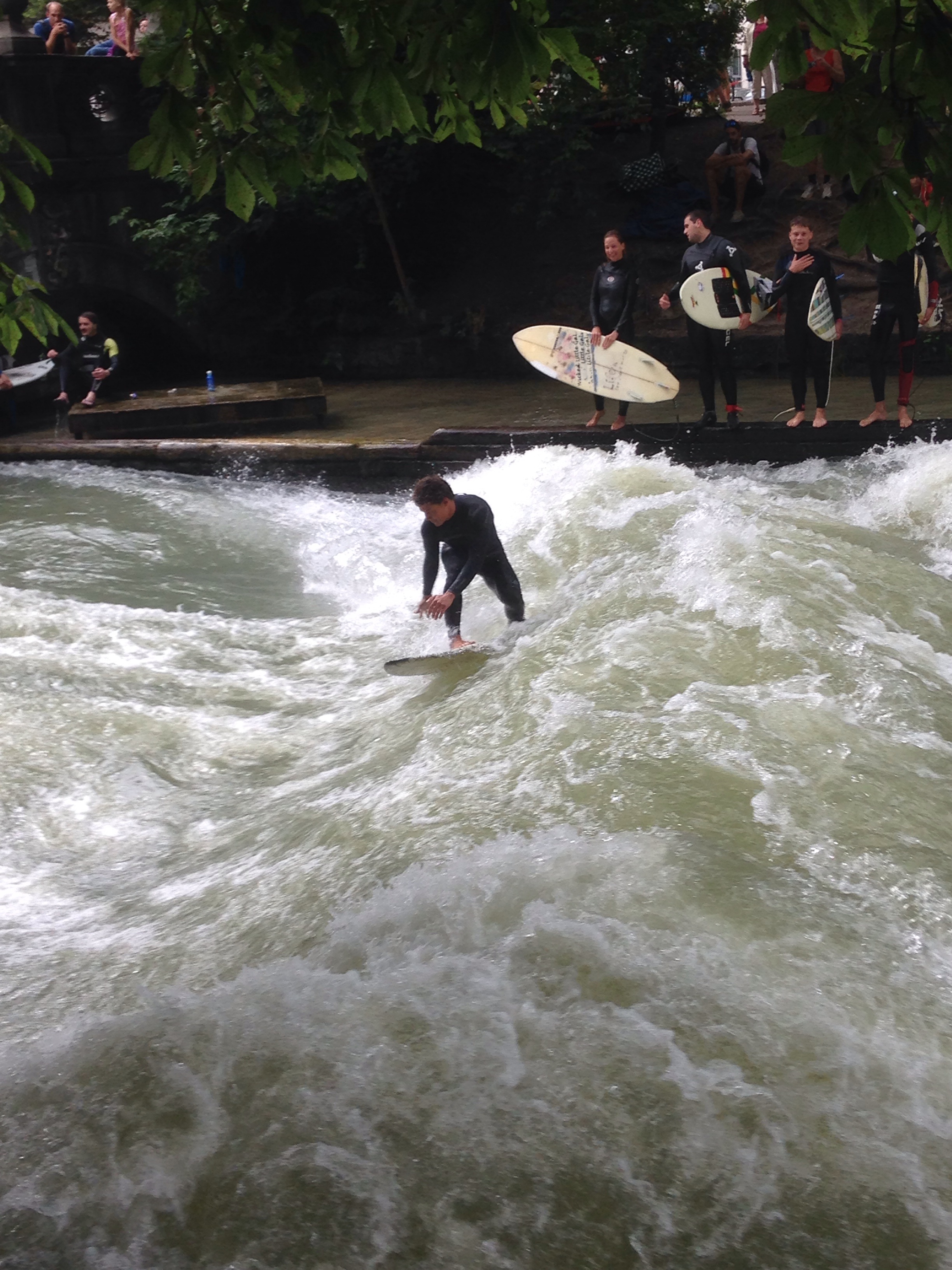 There is also a man made river called the Eisbach energetically flowing through the park. A Californian engineer-surfer dude came to Munich in the late 60’s and was impressed by the way the water flowed with great force under one of the bridges and had a vision to re-engineer the area to accommodate surfers. So surfing is now a year round activity in the heart of Munich! We stayed awhile to watch and we could have watched all day long. It is actually against the law but the people stood up against the government so they allowed a loop hole and call it the common sense law. If you choose to do it and get injured or killed the city is not responsible.