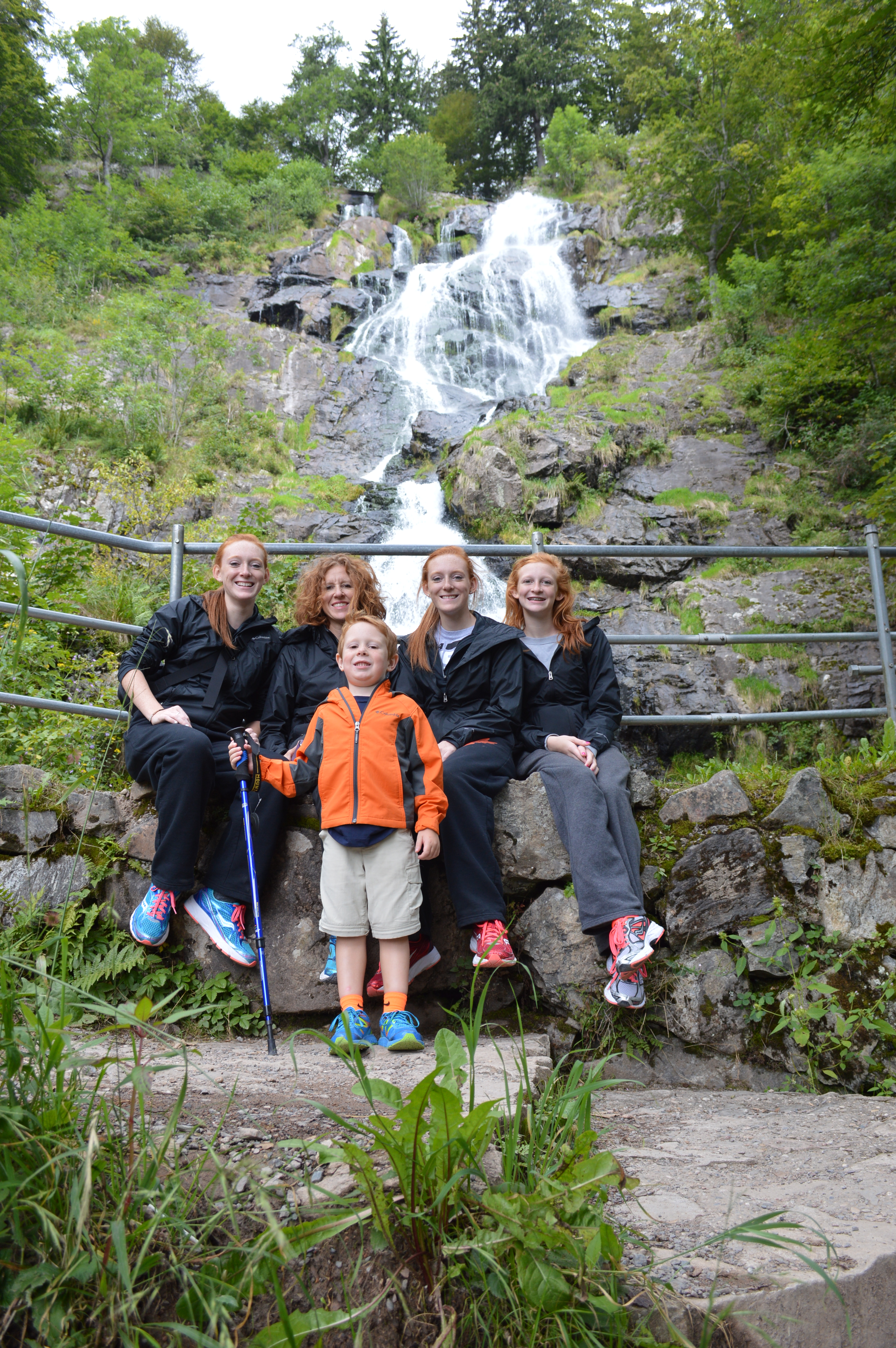 Our first adventure of the week was hiking to the Todtnauer Waterfall. We actually drove up the mountain so we could hike down to it. We pulled into the look-out area and I jumped out, ready to go. The jagged rocky path, steep and adventurous called my name…….interrupted by the cautionary voice of my husband, “Uh, wait a second. I don’t know about this. I don’t see any other cars and there is red tape that was marking it closed that someone ripped down.” Me- “it’s ripped down because it’s now open.” We argue back and forth a bit until the girls disappear down the trail. I follow and holler up to him, “it’s fine!” Actually, it was fine. The treacherous part only lasted a few minutes then it evened out to this lovely walking path. Den and I are so much a like in many ways and very different in many others, it’s what makes us…..US, and love him so much!