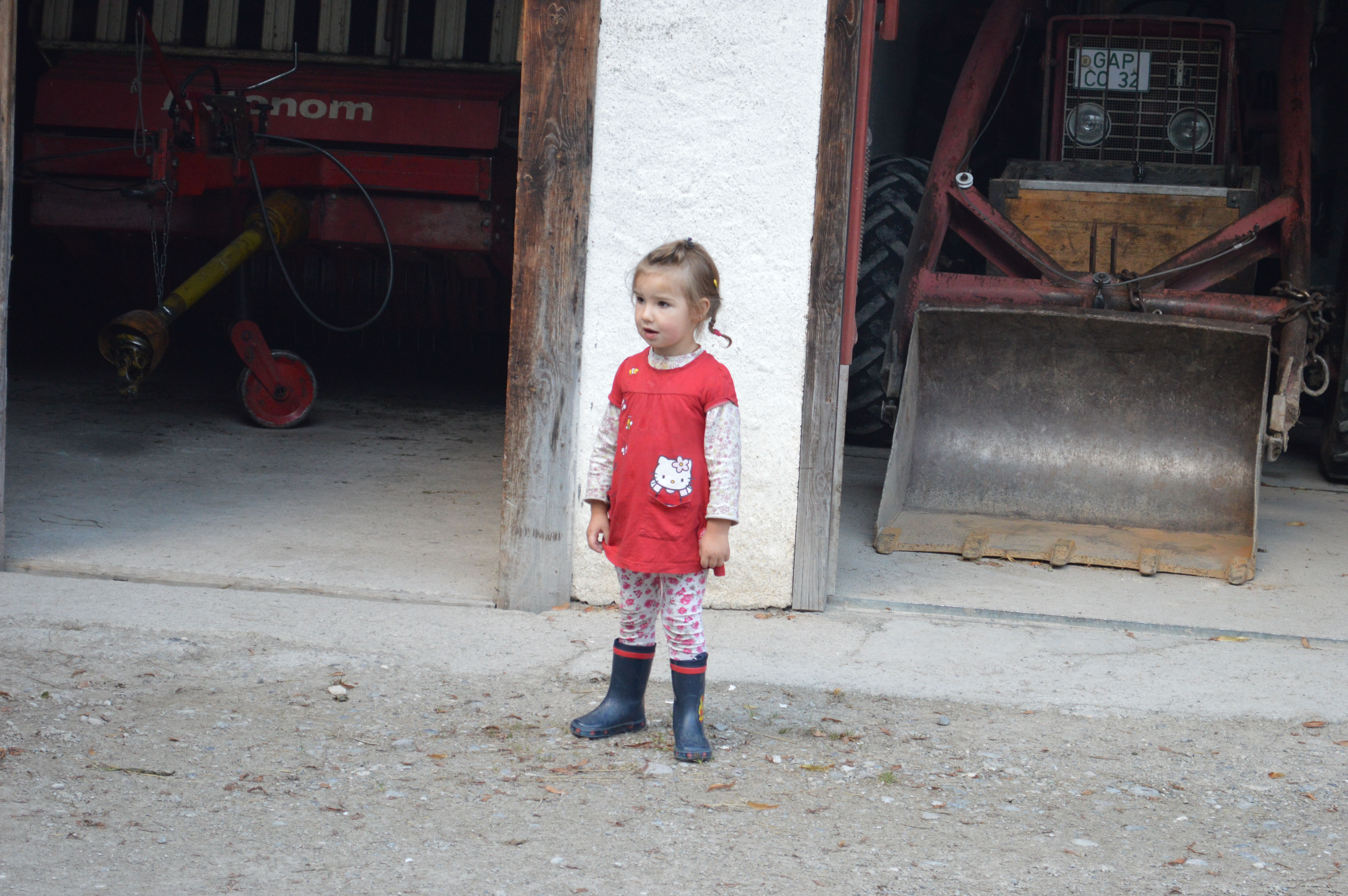 After we got settled, we went for a walk around our village. We kept smelling a farm-like aroma, but we couldn’t figure it out. We didn’t see any cows just a wet farm smell. We went down the road behind our guest house and saw at the back of some of these 3 story homes there were actual barns on the lower level. I could see cow rumps through a crack in the doors. A man wheel-barrowed cut grass on to a huge mound that was at least 8 feet high and 40 feet long! That was the smell, folks. We continued our walk and noticed more barns that were homes as well. A little girl was out helping her daddy and was so sweet and smiley as she watched us walk by.