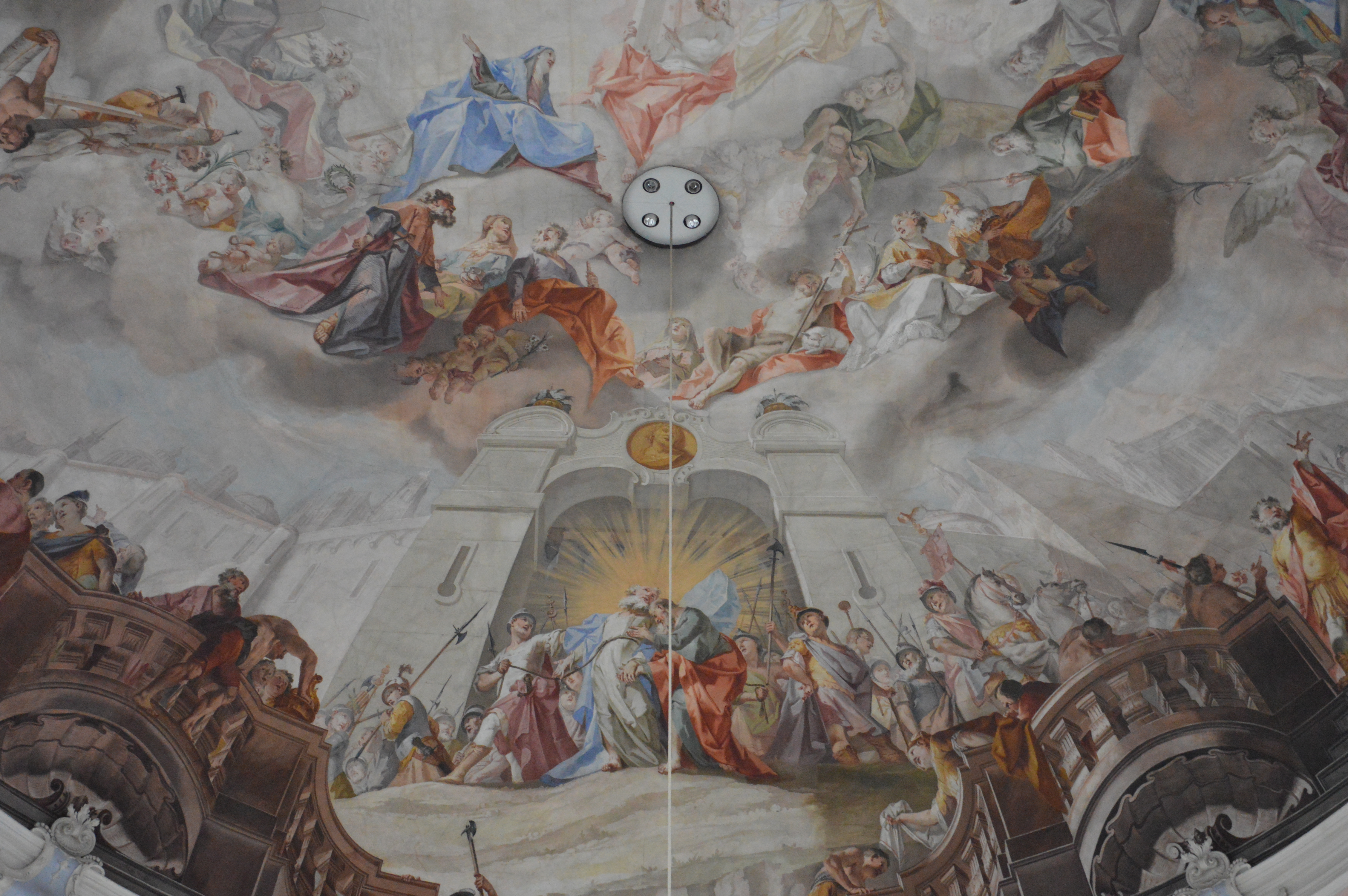 A beautifully detailed fresco of the martyrdom of the church patrons Sts. Peter and