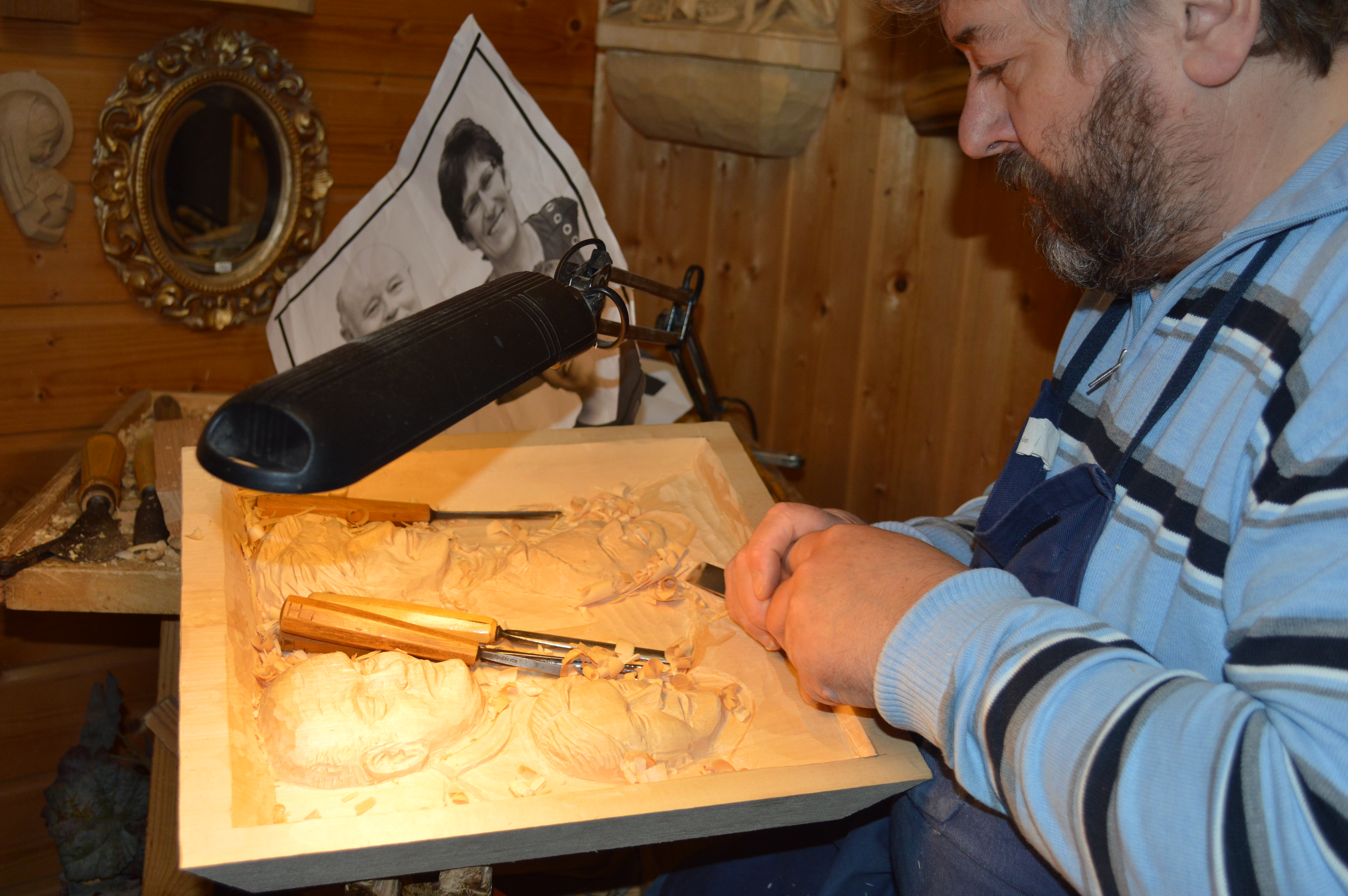 Oberammergau is also known for its wood carvers. We popped into a shop and watched this man work on a 3 dimensional family portrait.
